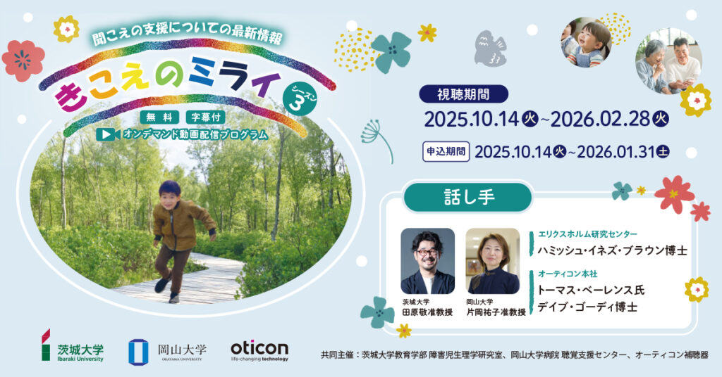 世界的な聴覚ケアグループ、デマントの補聴器旗艦ブランドである、オーティコン補聴器(本社:東京都品川区、プレジデント:齋藤 徹、以下 オーティコン)、茨城大学 教育学部 障害児生理学研究室(茨城県水戸市)および国立大学法人 岡山大学(本部:岡山市北区、学長:那須保友)の岡山大学病院 聴覚支援センターは共同で、オンデマンド動画配信プログラム「きこえのミライ」の第3弾、「きこえのミライ シーズン3」を、本日10月14日より配信開始いたします。